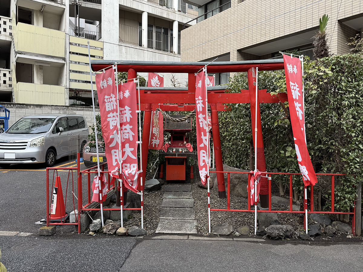 東京書籍本社ビルの一角にお祀りされている「東書稲荷神社(北区堀船)」。